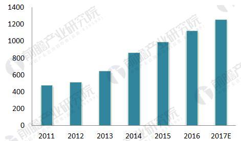 圖表2:2011-2017年中國傳感器市場規(guī)模情況(單位:億元)